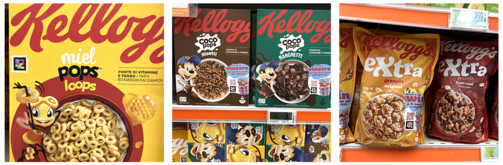 The designs for Kellogs® cereal are uncluttered, with an oversized logo that becomes part of the visual identity, functioning almost like a distinctive background pattern. And those unusual color combinations? A sophisticated spin to the classic warm hues we see on cereal boxes.