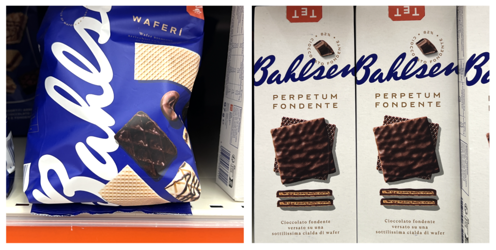 The layout simplicity and punchy colors are also seen here on these Bahlsen® wafers. The vertical white logo and the deep ultramarine blue background highlight the wafer sweets to perfection. Talk about impulse buying! No need to read how good they are. We can SEE how good they are.
