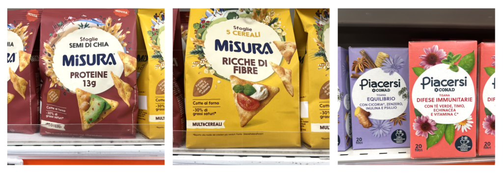 Functional snacks, such as Misura® treat the main benefit as a second-read element, in this case Protein, and Rich in Fiber. The illustration that surrounds the minimal, circular space in the center acts as an inspiring lifestyle frame for the essential information. Continuing the trend are the Piacersi® (literally Loving Yourself) herbal teas, with the Balance and Immunity as second read in a central space surrounded by natural ingredients.